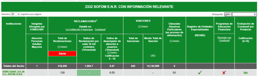 La siguiente información se encuentra en el Buró de Entidades Financieras y corresponde únicamente a GDM3 Capital S.A. de C.V., SOFOM E.N.R.